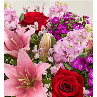All-around arrangement with red roses, pink Asiatic lilies, Limonium and stock, purple dianthus; accented with assorted greenery Artistically designed by our expert florists in a clear glass vase; measures 8"H Large arrangement measures approximately 18"H x 13"W Small arrangement measures approximately 15"H x 10"W Our florists select the freshest flowers available, so colors and varieties may vary due to local availability To ensure lasting beauty, Asiatic lilies may arrive in bud form, ready to bloom in a few days