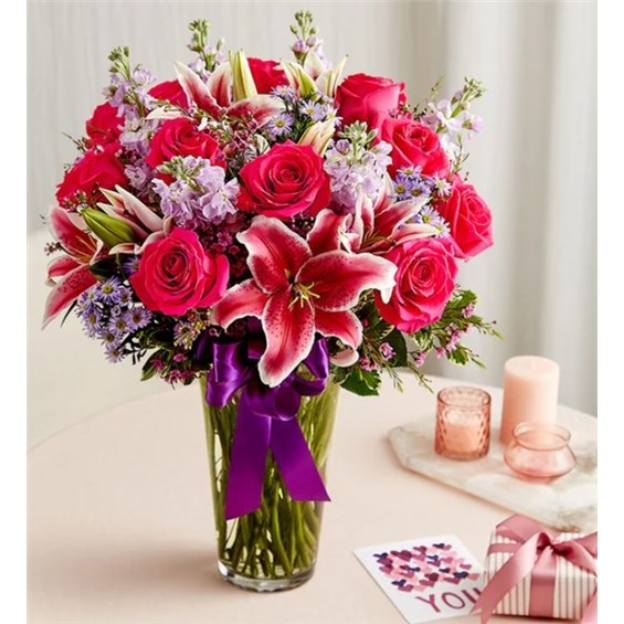 A gift means so much more when it comes from the heart. Our Valentine’s bouquet delivers on that sentiment, with radiant pink and purple blooms arranged in a glass vase. Finished with a purple satin ribbon, it’s a surprise that speaks volumes about how you feel.